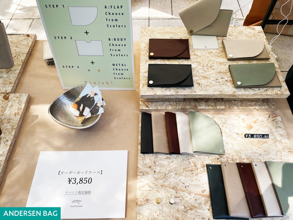 ハッと息を呑むような鮮やかなカラーバリエーションの財布や小物類で行き交う人々の足をとめていたのが「MUZICA VITA」です。また、小物類に加えてバッグも人気を呼び、「bell la bell」は優しい色合いのシュリンクレザーを使ったがま口タイプのミニ財布が代官山のお客様の心をつかみました。全工程を日本の職人が手掛けたジャパンメイドのスタイリッシュな革小物類で人気を集めたのは「EBINE」。独特の構造美を評価されるお客様が多く、その実力を代官山で示しました。