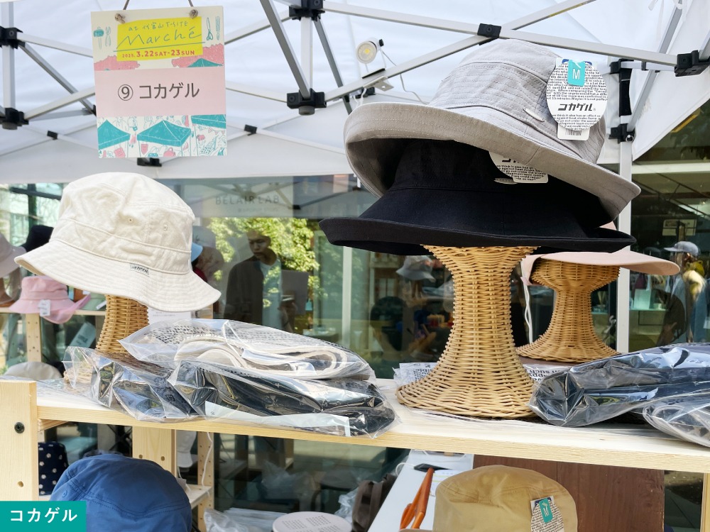 日差しが強くなったときに心強いのが「ATRENA/コカゲル」の帽子です。とりわけ、遮熱素材を内蔵して体感マイナス10℃を実現している「コカゲル」の帽子は試着される方が続出。代官山のまちにも「コカゲル」の帽子はよく映えました。