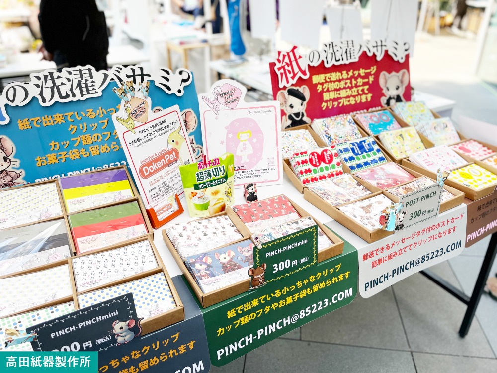 紙でできている洗濯バサミ「PINCH PINCH」や、組み立てるとクリップになりメッセージタグ付きのポストカードになる「POST-PINCH」など、創意と工夫に満ちた製品でにぎわっていたのが「高田紙器製作所」です。プラスチック射出成形金型製作、射出成形、治工具製作を手掛ける、いわゆる町工場の「ミヨシ」のブースでは、アニマルクリップを作れる手動射出成形機のワークショップを開催。めったに見るチャンスがない町工場の機械を使えるとあって大人にも子どもたちにも好評でした。さまざまな機能や形の自転車用ベル、熊避けベルを販売したのが「東京ベル製作所」。自転車用ベルの専門メーカーだけにラインナップが幅広く、消音機能がついたベルなどたくさんのお客様がベルを振る体験を楽しみました。